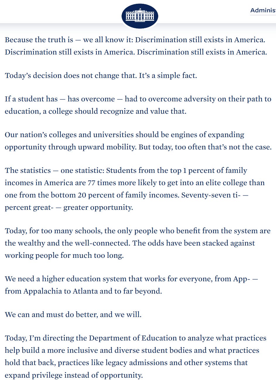 It passed in 1996 and won by 9pts. It remains on the books today. Yes, California has its own state law that says its colleges (which receive state funding) cannot use skin-color to discriminate on admissions. The very practices being challenged at Harvard and UNC would be unlawful under the California state constitution. Of course, we all know they were taking place at campuses like Stanford and UCLA. I would be surprised to find campuses who were not discriminating in violation of their own 1996 law. So this SCOTUS ruling last year was in line with the will of the Californian people. In line with the majority will of one of the bluest states in America. I ask again, who was Team Biden (Team Equity) representing when they attacked this ruling as wrong and abhorrent? They surely weren’t speaking on behalf of conservatives. And they weren’t speaking on behalf of most Californians either. Think I’m wrong there? Why, because 1996 was a long time ago? I’ve got that covered too…
